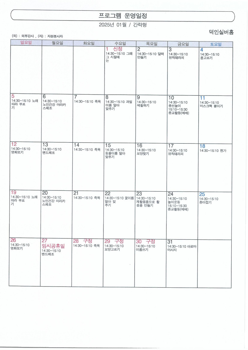 2025년 ♥덕인실버홈 1월 프로그램 계획표♥ 작성자 정보 관리자 작성 작성일 2025.01.08 13:20 컨텐츠 정보 55 조회 목록 본문 2025년 ♥덕인실버홈 1월 프로그램 계획표♥ SNS 공유 관련자료 이전 2025년 ♥덕인실버홈 3월 프로그램 계획표♥ 작성일 2025.03.01 11:42 다음 2024년 ♥덕인실버홈 12월 프로그램 계획표♥ 작성일 2024.12.09 17:55 댓글 0개 등록된 댓글이 없습니다. 로그인한 회원만 댓글 등록이 가능합니다. 목록