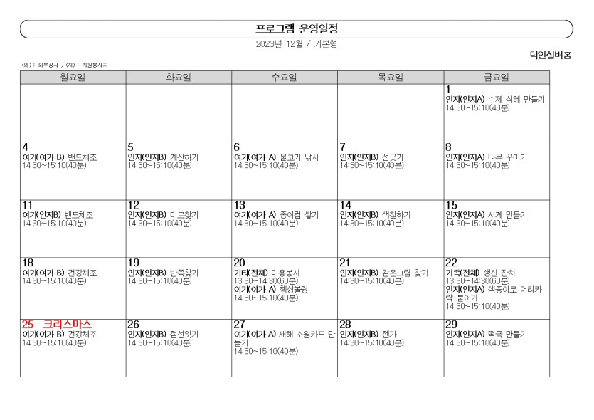 2023년 ♥덕인실버홈 12월 프로그램 계획 작성자 정보 관리자 작성 작성일 2023.12.04 11:59 컨텐츠 정보 184 조회 목록 본문 2023년 ♥덕인실버홈 12월 프로그램 계획 SNS 공유 관련자료 이전 2024년 ♥덕인실버홈 1월 프로그램 계획표♥ 작성일 2023.12.31 21:52 다음 2023년 ♥덕인실버홈 11월 프로그램 계획 작성일 2023.11.02 11:30 댓글 0개 등록된 댓글이 없습니다. 로그인한 회원만 댓글 등록이 가능합니다. 목록