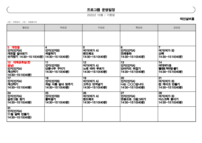 2022년 ♥덕인실버홈 10월 프로그램 계획 ♥ 작성자 정보 관리자 작성 작성일 2022.10.03 17:44 컨텐츠 정보 431 조회 목록 본문 2022년 ♥덕인실버홈 10월 프로그램 계획 ♥ SNS 공유 관련자료 이전 2022년 ♥덕인실버홈 11월 프로그램 계획 ♥ 작성일 2022.11.01 17:06 다음 2022년 ♥덕인실버홈 9월 프로그램 계획 ♥ 작성일 2022.09.01 17:27 댓글 0개 등록된 댓글이 없습니다. 로그인한 회원만 댓글 등록이 가능합니다. 목록