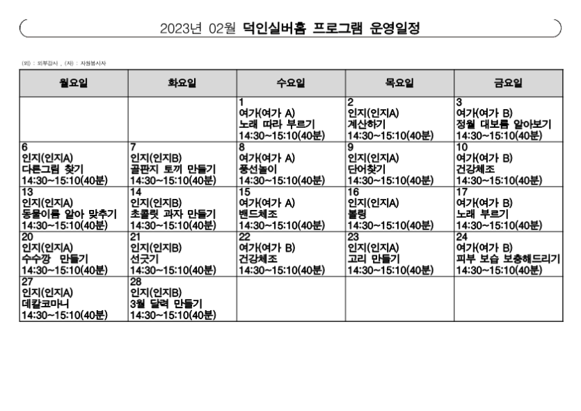 2023년 ♥덕인실버홈 2월 프로그램 계획 ♥ 작성자 정보 관리자 작성 작성일 2023.02.01 16:08 컨텐츠 정보 383 조회 목록 본문 2023년 ♥덕인실버홈 2월 프로그램 계획 ♥ SNS 공유 관련자료 이전 2023년 ♥덕인실버홈 3월 프로그램 계획 ♥ 작성일 2023.03.01 17:49 다음 2023년 ♥덕인실버홈 1월 프로그램 계획 ♥ 작성일 2023.01.02 17:00 댓글 0개 등록된 댓글이 없습니다. 로그인한 회원만 댓글 등록이 가능합니다. 목록