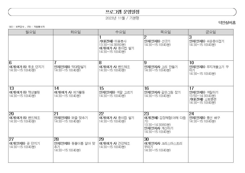 2023년 ♥덕인실버홈 11월 프로그램 계획 작성자 정보 관리자 작성 작성일 2023.11.02 11:30 컨텐츠 정보 224 조회 목록 본문 2023년 ♥덕인실버홈 11월 프로그램 계획 SNS 공유 관련자료 이전 2023년 ♥덕인실버홈 12월 프로그램 계획 작성일 2023.12.04 11:59 다음 2023년 ♥덕인실버홈 10월 프로그램 계획 작성일 2023.10.10 09:22 댓글 0개 등록된 댓글이 없습니다. 로그인한 회원만 댓글 등록이 가능합니다. 목록