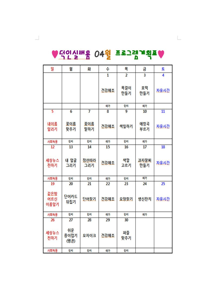 ♥덕인실버홈 04월 프로그램계획표 및 식단표♥ 작성자 정보 관리자 작성 작성일 2020.05.18 15:07 컨텐츠 정보 817 조회 목록 본문 ♥덕인실버홈 04월 프로그램계획표 및 식단표♥ SNS 공유 관련자료 이전 ♥덕인실버홈 05월 프로그램계획표 및 식단표♥ 작성일 2020.05.18 15:08 다음 ♥덕인실버홈 03월 프로그램계획표 및 식단표♥ 작성일 2020.03.03 11:51 댓글 0개 등록된 댓글이 없습니다. 로그인한 회원만 댓글 등록이 가능합니다. 목록
