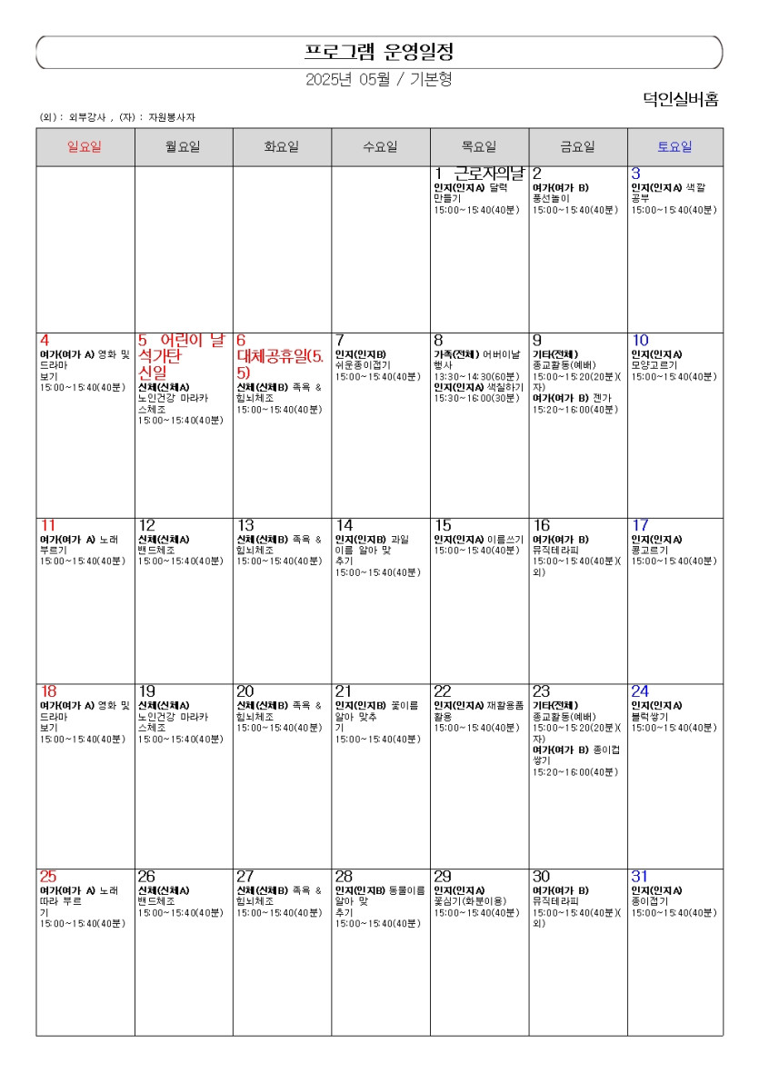 2025년 ♥덕인실버홈 5월 프로그램 계획표♥ 작성자 정보 관리자 작성 작성일 2025.04.03 12:28 컨텐츠 정보 49 조회 목록 본문 2025년 ♥덕인실버홈 4월 프로그램 계획표♥ SNS 공유 관련자료 이전 2025년 ♥덕인실버홈 6월 프로그램 계획표♥ 작성일 2025.10.22 22:46 다음 2025년 ♥덕인실버홈 4월 프로그램 계획표♥ 작성일 2025.04.03 12:28 댓글 0개 등록된 댓글이 없습니다. 로그인한 회원만 댓글 등록이 가능합니다. 목록