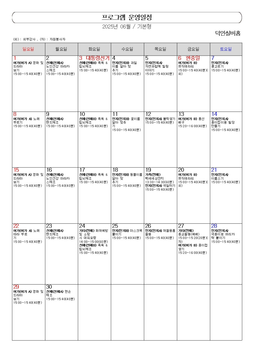 2025년 ♥덕인실버홈 6월 프로그램 계획표♥ 작성자 정보 최고관리자 작성 작성일 2025.10.22 22:46 컨텐츠 정보 17 조회 목록 본문 2025년 ♥덕인실버홈 6월 프로그램 계획표♥ SNS 공유 관련자료 이전 2025년 ♥덕인실버홈 7월 프로그램 계획표♥ 작성일 2025.10.22 22:46 다음 2025년 ♥덕인실버홈 5월 프로그램 계획표♥ 작성일 2025.04.03 12:28 댓글 0개 등록된 댓글이 없습니다. 로그인한 회원만 댓글 등록이 가능합니다. 목록