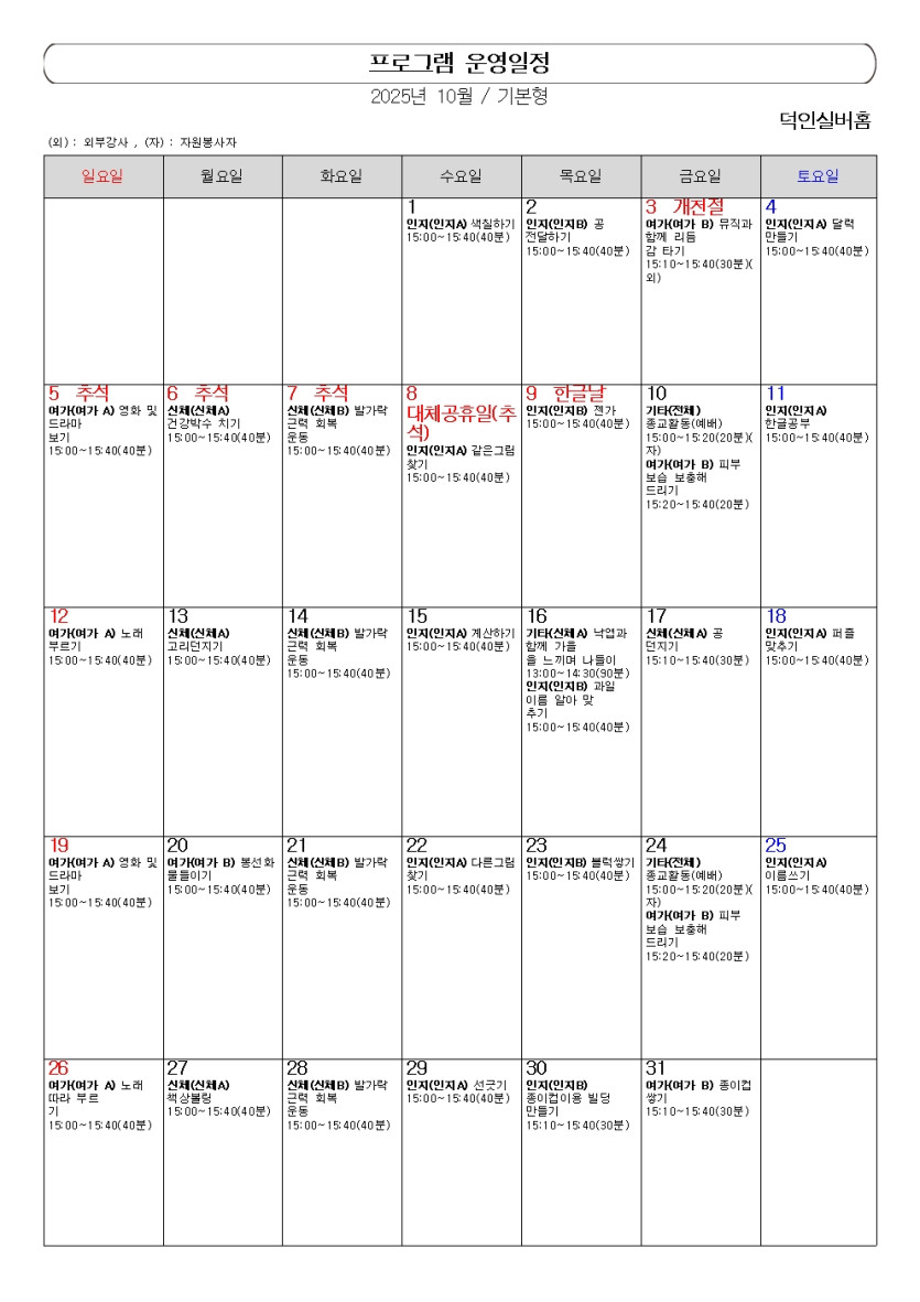 2025년 ♥덕인실버홈 10월 프로그램 계획표♥ 작성자 정보 최고관리자 작성 작성일 2025.10.22 22:48 컨텐츠 정보 15 조회 목록 본문 2025년 ♥덕인실버홈 10월 프로그램 계획표♥ SNS 공유 관련자료 이전 2025년 ♥덕인실버홈 11월 프로그램 계획표♥ 작성일 2025.10.30 09:58 다음 2025년 ♥덕인실버홈 9월 프로그램 계획표♥ 작성일 2025.10.22 22:47 댓글 0개 등록된 댓글이 없습니다. 로그인한 회원만 댓글 등록이 가능합니다. 목록