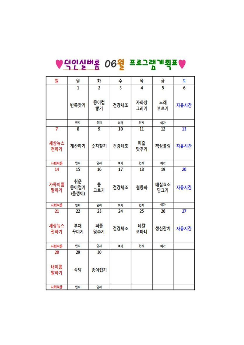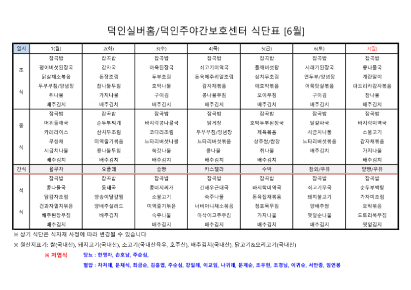 ♥덕인실버홈 06월 프로그램계획표 및 식단표♥ 작성자 정보 관리자 작성 작성일 2020.05.29 12:07 컨텐츠 정보 806 조회 목록 본문 ♥덕인실버홈 06월 프로그램계획표 및 식단표♥ SNS 공유 관련자료 이전 ♥덕인실버홈 07월 프로그램계획표 및 식단표♥ 작성일 2020.06.26 15:16 다음 ♥덕인실버홈 05월 프로그램계획표 및 식단표♥ 작성일 2020.05.18 15:08 댓글 0개 등록된 댓글이 없습니다. 로그인한 회원만 댓글 등록이 가능합니다. 목록