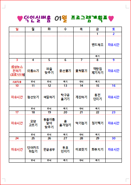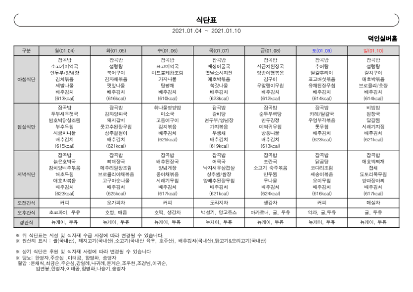2021-♥덕인실버홈 1월 프로그램계획표 및 식단표♥ 작성자 정보 관리자 작성 작성일 2021.05.04 13:03 컨텐츠 정보 895 조회 목록 본문 2021-♥덕인실버홈 1월 프로그램계획표 및 식단표♥ SNS 공유 관련자료 이전 2021-♥덕인실버홈 2월 프로그램계획표 및 식단표♥ 작성일 2021.05.04 13:03 다음 ♥덕인실버홈 12월 프로그램계획표 및 식단표♥ 작성일 2021.05.04 12:12 댓글 0개 등록된 댓글이 없습니다. 로그인한 회원만 댓글 등록이 가능합니다. 목록