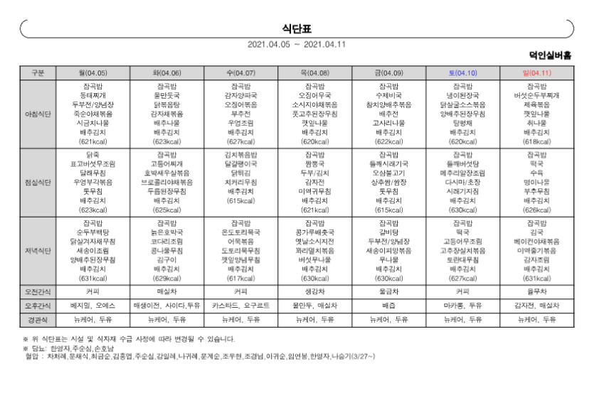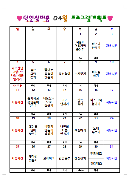 2021-♥덕인실버홈 4월 프로그램계획표 및 식단표♥ 작성자 정보 관리자 작성 작성일 2021.05.04 13:04 컨텐츠 정보 903 조회 목록 본문 2021-♥덕인실버홈 4월 프로그램계획표 및 식단표♥ SNS 공유 관련자료 이전 2021-♥덕인실버홈 5월 프로그램계획표 및 식단표♥ 작성일 2021.07.20 10:05 다음 2021-♥덕인실버홈 3월 프로그램계획표 및 식단표♥ 작성일 2021.05.04 13:03 댓글 0개 등록된 댓글이 없습니다. 로그인한 회원만 댓글 등록이 가능합니다. 목록