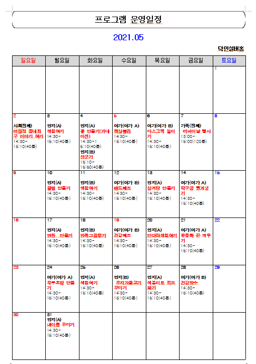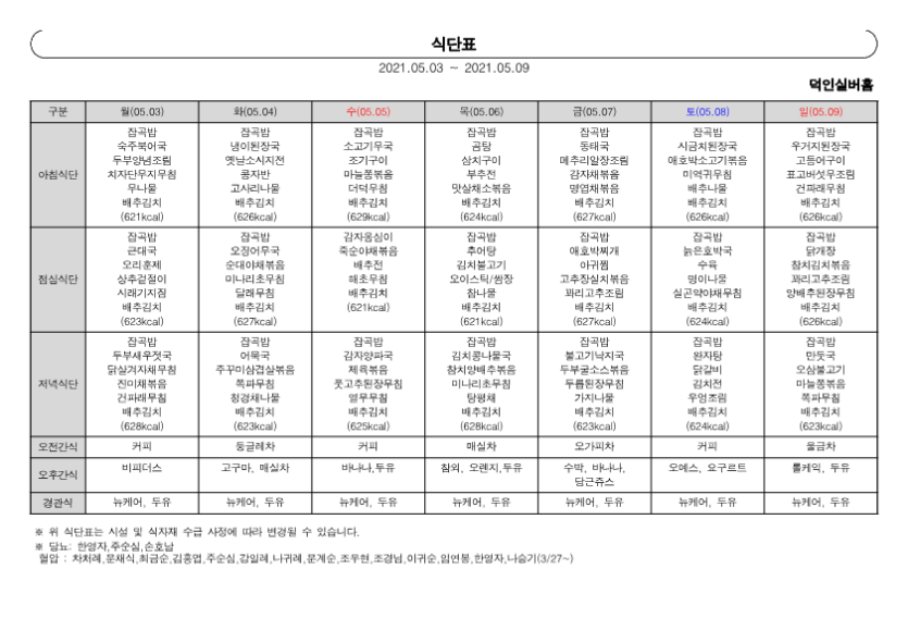2021-♥덕인실버홈 5월 프로그램계획표 및 식단표♥ 작성자 정보 관리자 작성 작성일 2021.07.20 10:05 컨텐츠 정보 934 조회 목록 본문 2021-♥덕인실버홈 5월 프로그램계획표 및 식단표♥ SNS 공유 관련자료 이전 2021-♥덕인실버홈 6월 프로그램계획표 및 식단표♥ 작성일 2021.07.20 10:09 다음 2021-♥덕인실버홈 4월 프로그램계획표 및 식단표♥ 작성일 2021.05.04 13:04 댓글 0개 등록된 댓글이 없습니다. 로그인한 회원만 댓글 등록이 가능합니다. 목록