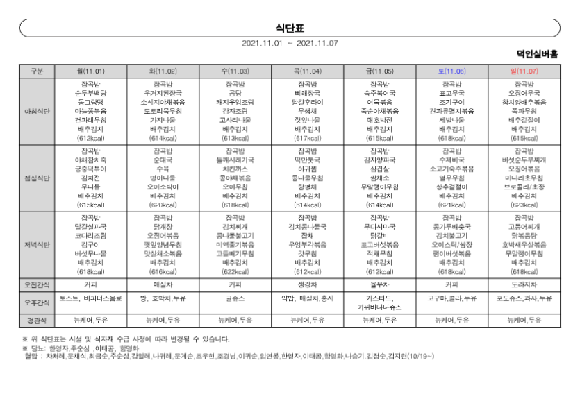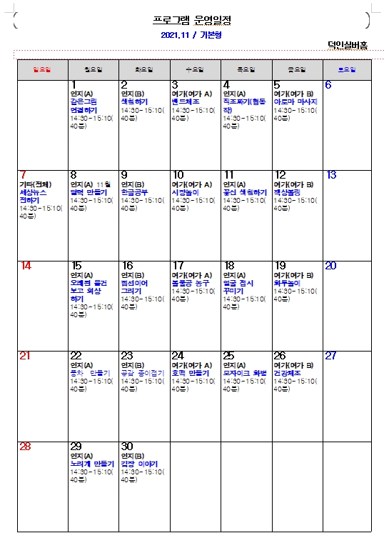 2021-♥덕인실버홈 11월 프로그램계획표 및 식단표♥ 작성자 정보 관리자 작성 작성일 2021.12.10 10:00 컨텐츠 정보 703 조회 목록 본문 2021-♥덕인실버홈 11월 프로그램계획표 및 식단표♥ SNS 공유 관련자료 이전 2021-♥덕인실버홈 12월 프로그램계획표 및 식단표♥ 작성일 2021.12.10 10:00 다음 2021-♥덕인실버홈 10월 프로그램계획표 및 식단표♥ 작성일 2021.12.10 10:00 댓글 0개 등록된 댓글이 없습니다. 로그인한 회원만 댓글 등록이 가능합니다. 목록