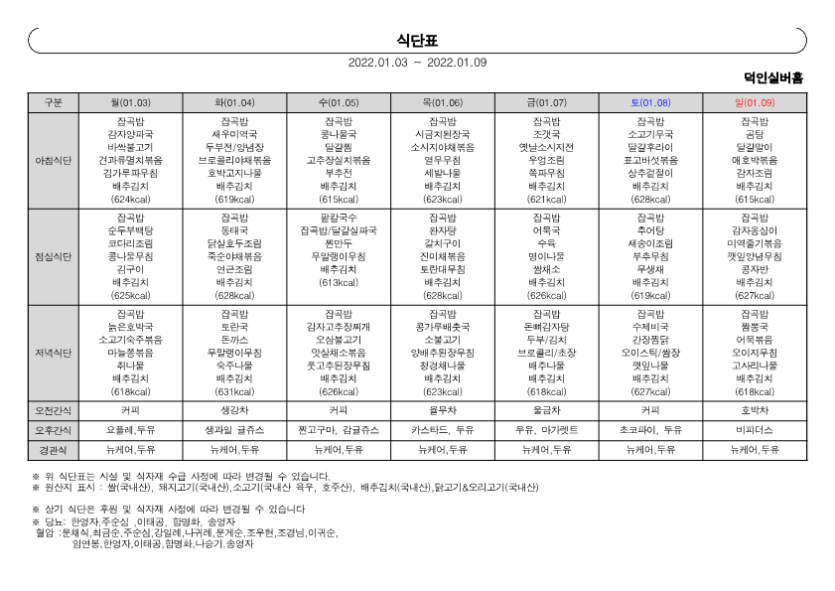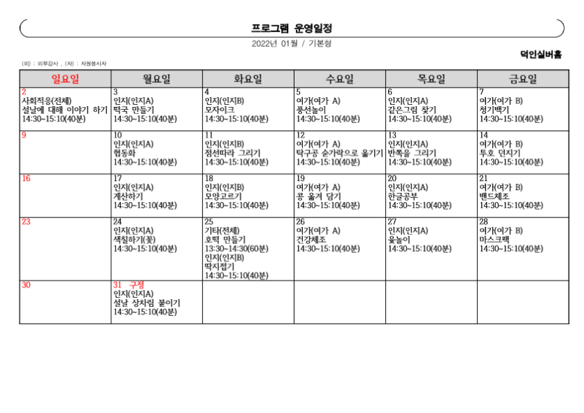 2022-♥덕인실버홈 1월 프로그램계획표 및 식단표♥ 작성자 정보 관리자 작성 작성일 2022.01.07 10:48 컨텐츠 정보 701 조회 목록 본문 2022-♥덕인실버홈 1월 프로그램계획표 및 식단표♥ SNS 공유 관련자료 이전 2022년 ♥덕인실버홈 2월 프로그램계획표 및 식단표♥ 작성일 2022.02.15 14:25 다음 2021-♥덕인실버홈 12월 프로그램계획표 및 식단표♥ 작성일 2021.12.10 10:00 댓글 0개 등록된 댓글이 없습니다. 로그인한 회원만 댓글 등록이 가능합니다. 목록