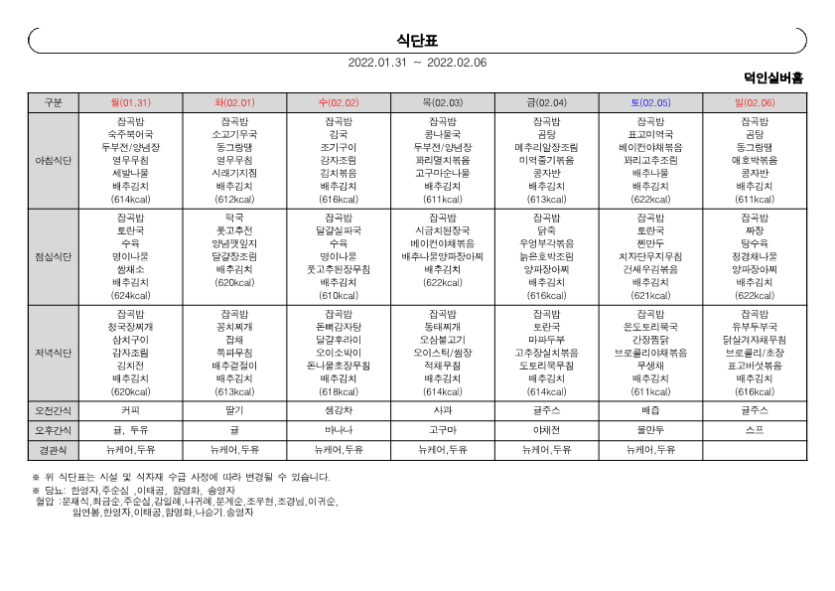 2022년 ♥덕인실버홈 2월 프로그램계획표 및 식단표♥ 작성자 정보 관리자 작성 작성일 2022.02.15 14:25 컨텐츠 정보 715 조회 목록 본문 덕인실버홈 2월 프로그램 운영일정표 및 식단표 SNS 공유 관련자료 이전 2022년 ♥덕인실버홈 3월 프로그램 계획표 및 식단표♥ 작성일 2022.03.01 09:56 다음 2022-♥덕인실버홈 1월 프로그램계획표 및 식단표♥ 작성일 2022.01.07 10:48 댓글 0개 등록된 댓글이 없습니다. 로그인한 회원만 댓글 등록이 가능합니다. 목록