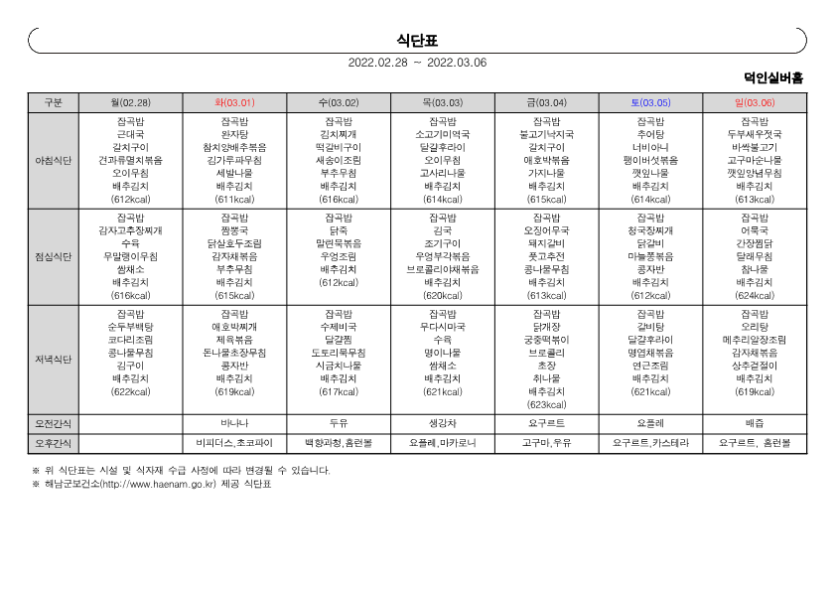 2022년 ♥덕인실버홈 3월 프로그램 계획표 및 식단표♥ 작성자 정보 관리자 작성 작성일 2022.03.01 09:56 컨텐츠 정보 750 조회 목록 본문 2022년 덕인실버홈 3월 프로그램 계획표 및 식단표 SNS 공유 관련자료 이전 2022년 ♥덕인실버홈 4월 프로그램 계획표 및 식단표♥ 작성일 2022.04.01 09:24 다음 2022년 ♥덕인실버홈 2월 프로그램계획표 및 식단표♥ 작성일 2022.02.15 14:25 댓글 0개 등록된 댓글이 없습니다. 로그인한 회원만 댓글 등록이 가능합니다. 목록