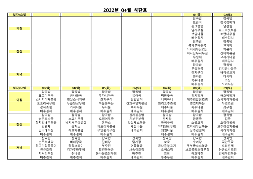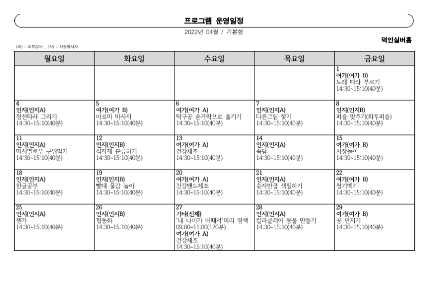 2022년 ♥덕인실버홈 4월 프로그램 계획표 및 식단표♥ 작성자 정보 관리자 작성 작성일 2022.04.01 09:24 컨텐츠 정보 669 조회 목록 본문 출처) 해남군 보건소 * 자제 수급에 따라 변동될 수 있습니다. SNS 공유 관련자료 이전 2022년 ♥덕인실버홈 5월 프로그램 계획표 및 식단표♥ 작성일 2022.04.29 15:49 다음 2022년 ♥덕인실버홈 3월 프로그램 계획표 및 식단표♥ 작성일 2022.03.01 09:56 댓글 0개 등록된 댓글이 없습니다. 로그인한 회원만 댓글 등록이 가능합니다. 목록
