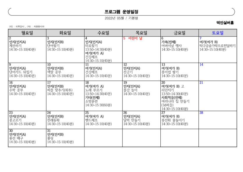2022년 ♥덕인실버홈 5월 프로그램 계획표 및 식단표♥ 작성자 정보 관리자 작성 작성일 2022.04.29 15:49 컨텐츠 정보 601 조회 목록 본문 2022년 덕인실버홈 5월 프로그램 계획표 및 식단표 SNS 공유 관련자료 이전 2022년 ♥덕인실버홈 6월 프로그램 계획 및 식단표♥ 작성일 2022.06.04 14:26 다음 2022년 ♥덕인실버홈 4월 프로그램 계획표 및 식단표♥ 작성일 2022.04.01 09:24 댓글 0개 등록된 댓글이 없습니다. 로그인한 회원만 댓글 등록이 가능합니다. 목록