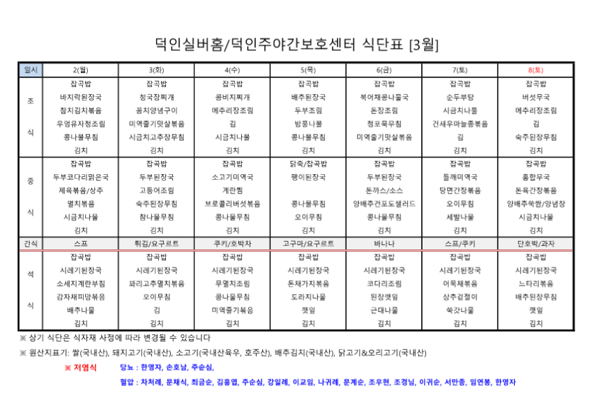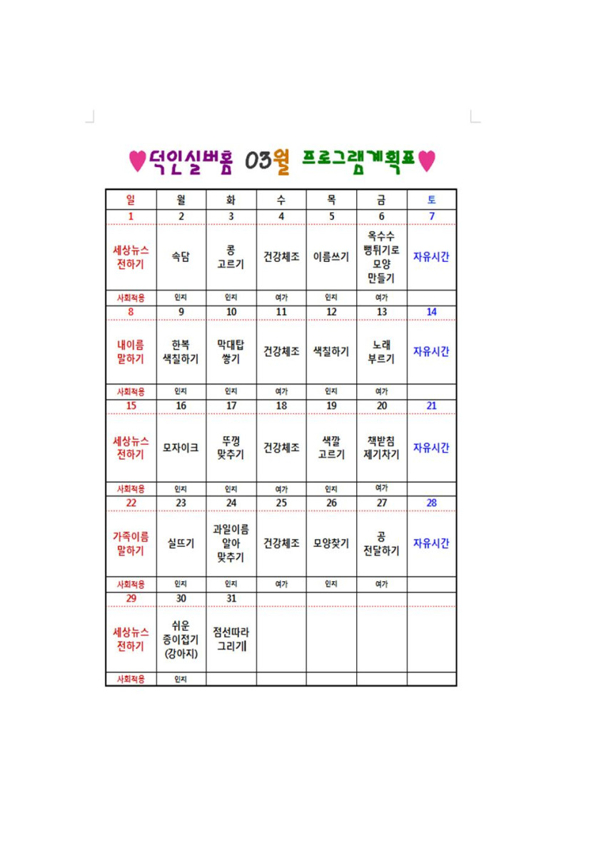 ♥덕인실버홈 03월 프로그램계획표 및 식단표♥ 작성자 정보 관리자 작성 작성일 2020.03.03 11:51 컨텐츠 정보 845 조회 목록 본문 ♥덕인실버홈 03월 프로그램계획표 및 식단표♥ SNS 공유 관련자료 이전 ♥덕인실버홈 04월 프로그램계획표 및 식단표♥ 작성일 2020.05.18 15:07 다음 ♥덕인실버홈 02월 프로그램계획표 및 식단표♥ 작성일 2020.02.20 09:45 댓글 0개 등록된 댓글이 없습니다. 로그인한 회원만 댓글 등록이 가능합니다. 목록