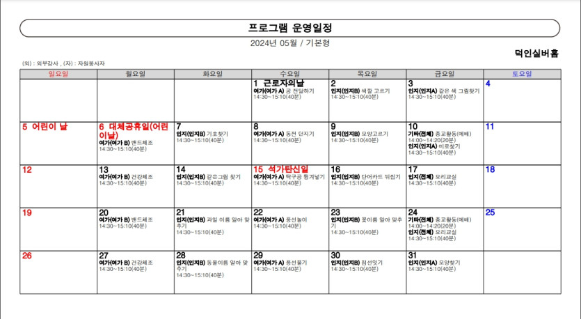 2024년 ♥덕인실버홈 5월 프로그램 계획표♥ 작성자 정보 관리자 작성 작성일 2024.05.09 17:43 컨텐츠 정보 112 조회 목록 본문 2024년 ♥덕인실버홈 5월 프로그램 계획표♥ SNS 공유 관련자료 이전 2024년 ♥덕인실버홈 6월 프로그램 계획표♥ 작성일 2024.06.04 13:55 다음 2024년 ♥덕인실버홈 4월 프로그램 계획표♥ 작성일 2024.04.01 14:29 댓글 0개 등록된 댓글이 없습니다. 로그인한 회원만 댓글 등록이 가능합니다. 목록
