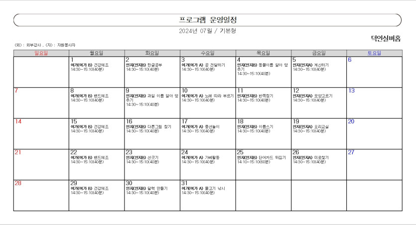 2024년 ♥덕인실버홈 7월 프로그램 계획표♥ 작성자 정보 관리자 작성 작성일 2024.07.03 11:47 컨텐츠 정보 90 조회 목록 본문 2024년 ♥덕인실버홈 7월 프로그램 계획표♥ SNS 공유 관련자료 이전 2024년 ♥덕인실버홈 8월 프로그램 계획표♥ 작성일 2024.08.01 13:11 다음 2024년 ♥덕인실버홈 6월 프로그램 계획표♥ 작성일 2024.06.04 13:55 댓글 0개 등록된 댓글이 없습니다. 로그인한 회원만 댓글 등록이 가능합니다. 목록