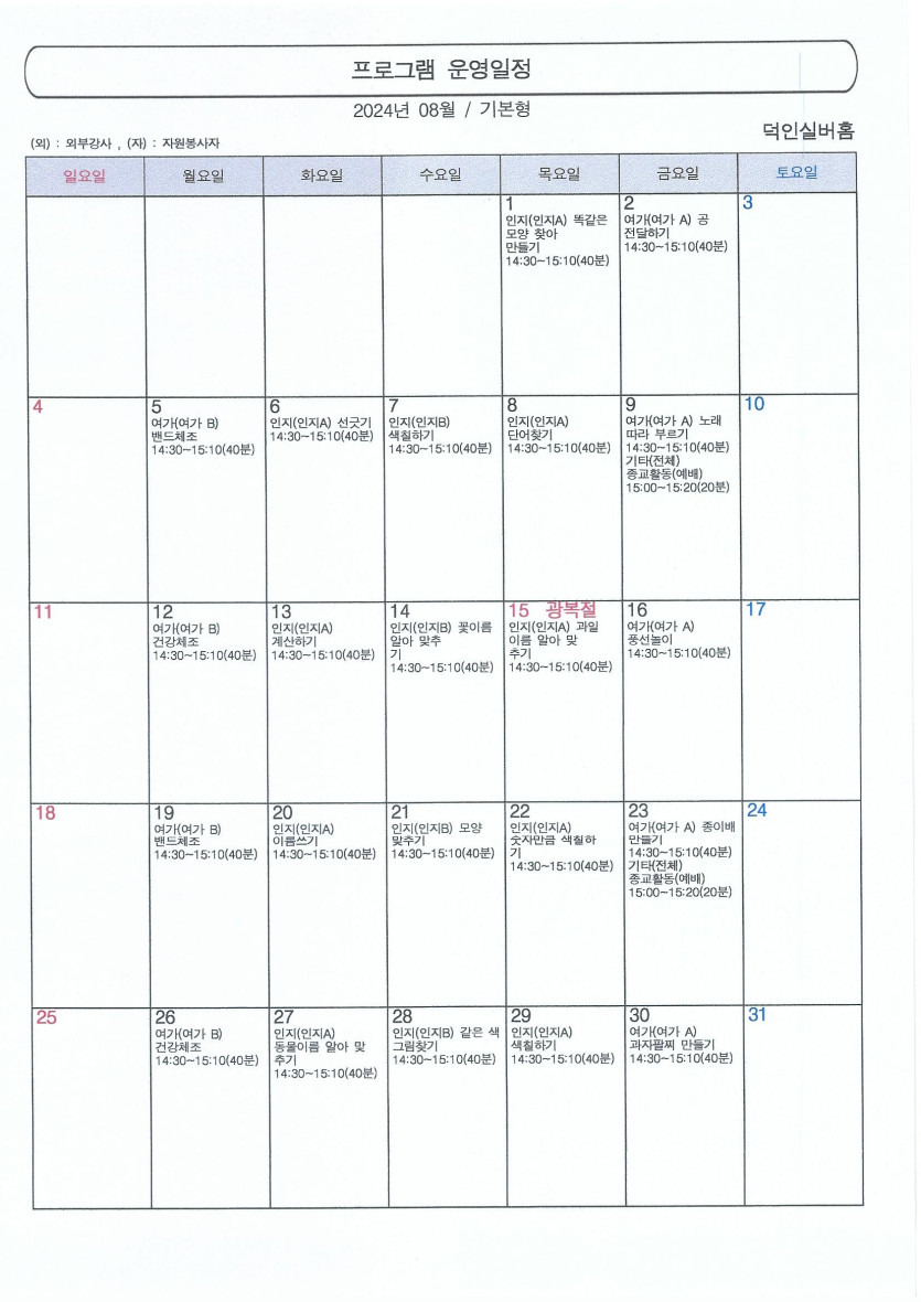 2024년 ♥덕인실버홈 8월 프로그램 계획표♥ 작성자 정보 관리자 작성 작성일 2024.08.01 13:11 컨텐츠 정보 88 조회 목록 본문 2024년 ♥덕인실버홈 7월 프로그램 계획표♥ SNS 공유 관련자료 이전 2024년 ♥덕인실버홈 9월 프로그램 계획표♥ 작성일 2024.09.05 11:02 다음 2024년 ♥덕인실버홈 7월 프로그램 계획표♥ 작성일 2024.07.03 11:47 댓글 0개 등록된 댓글이 없습니다. 로그인한 회원만 댓글 등록이 가능합니다. 목록