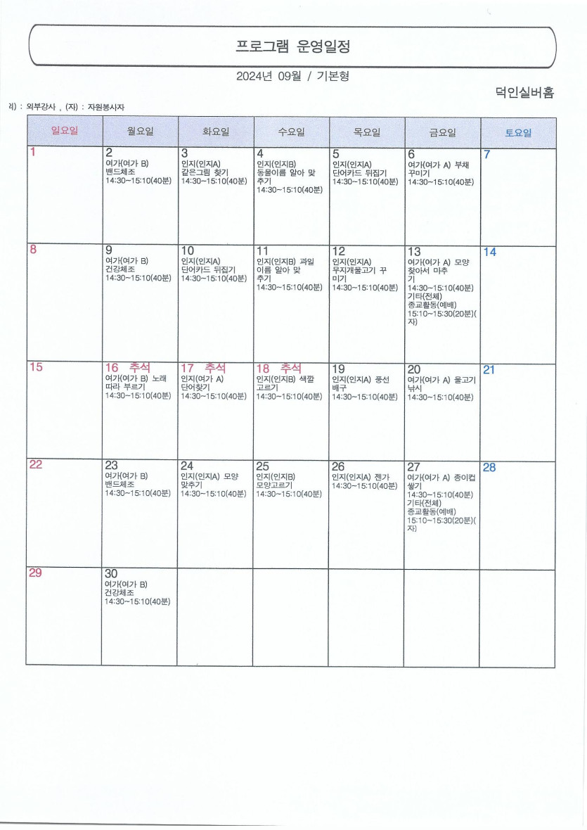 2024년 ♥덕인실버홈 9월 프로그램 계획표♥ 작성자 정보 관리자 작성 작성일 2024.09.05 11:02 컨텐츠 정보 84 조회 목록 본문 2024년 ♥덕인실버홈 9월 프로그램 계획표♥ SNS 공유 관련자료 이전 2024년 ♥덕인실버홈 10월 프로그램 계획표♥ 작성일 2024.10.04 14:32 다음 2024년 ♥덕인실버홈 8월 프로그램 계획표♥ 작성일 2024.08.01 13:11 댓글 0개 등록된 댓글이 없습니다. 로그인한 회원만 댓글 등록이 가능합니다. 목록