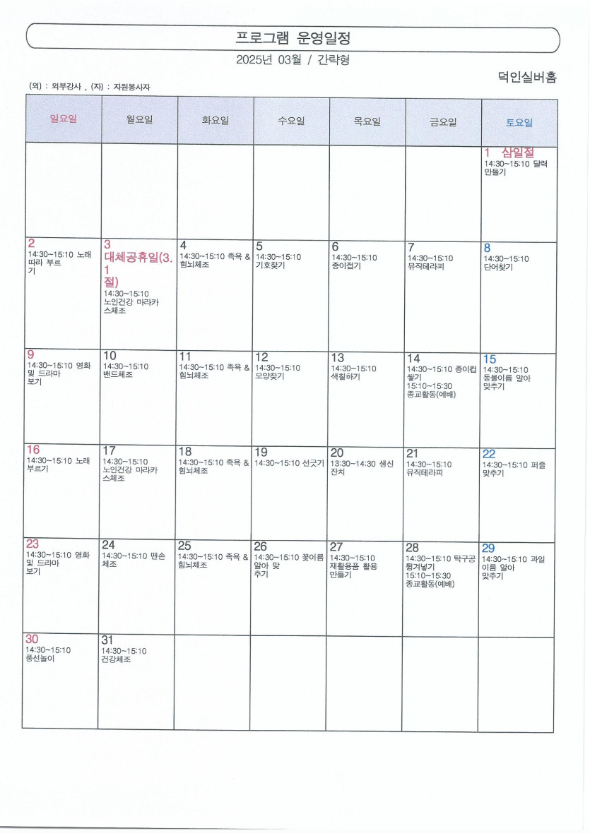 2025년 ♥덕인실버홈 3월 프로그램 계획표♥ 작성자 정보 관리자 작성 작성일 2025.03.01 11:42 컨텐츠 정보 23 조회 목록 본문 2025년 ♥덕인실버홈 3월 프로그램 계획표♥ SNS 공유 관련자료 이전 2025년 ♥덕인실버홈 4월 프로그램 계획표♥ 작성일 2025.04.03 12:28 다음 2025년 ♥덕인실버홈 1월 프로그램 계획표♥ 작성일 2025.01.08 13:20 댓글 0개 등록된 댓글이 없습니다. 로그인한 회원만 댓글 등록이 가능합니다. 목록