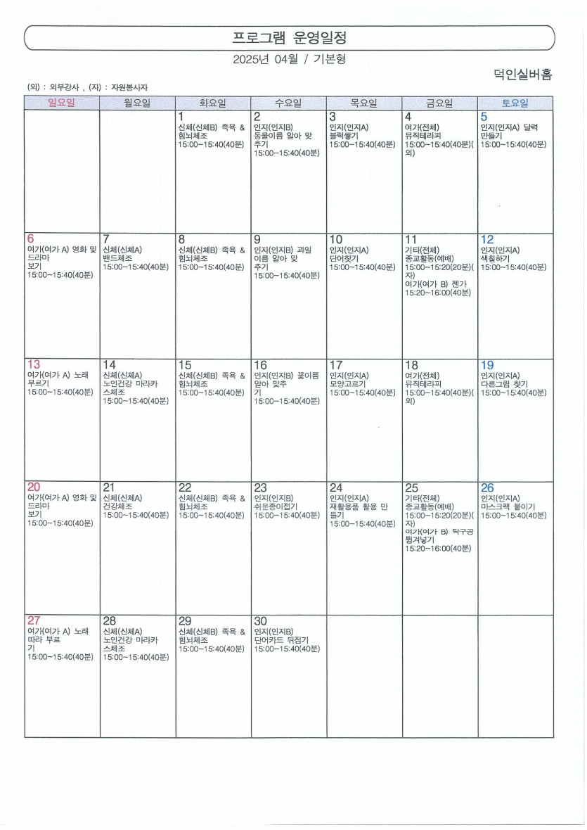 2025년 ♥덕인실버홈 4월 프로그램 계획표♥ 작성자 정보 관리자 작성 작성일 2025.04.03 12:28 컨텐츠 정보 28 조회 목록 본문 2025년 ♥덕인실버홈 4월 프로그램 계획표♥ SNS 공유 관련자료 다음 2025년 ♥덕인실버홈 3월 프로그램 계획표♥ 작성일 2025.03.01 11:42 댓글 0개 등록된 댓글이 없습니다. 로그인한 회원만 댓글 등록이 가능합니다. 목록