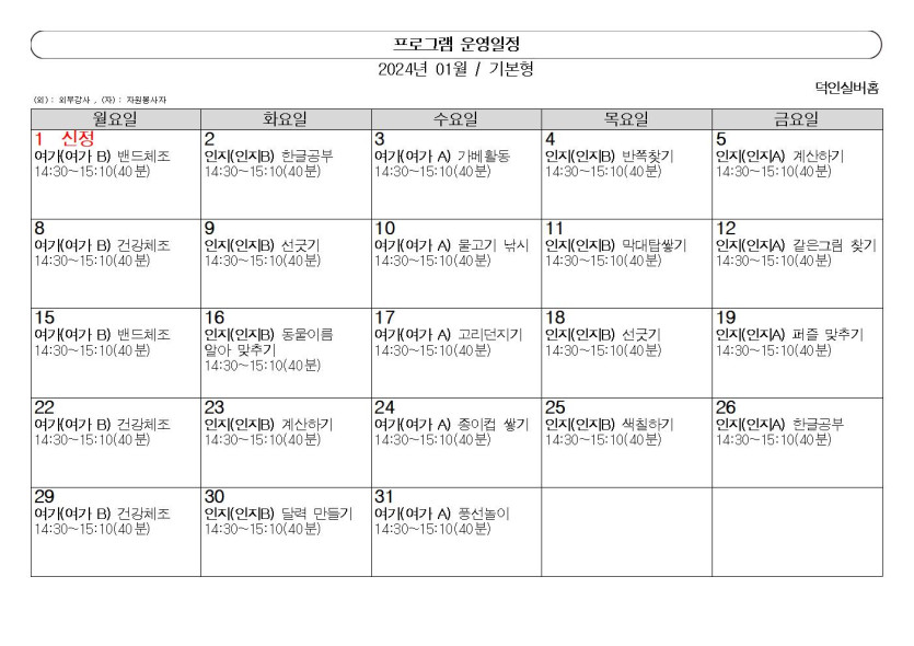 2024년 ♥덕인실버홈 1월 프로그램 계획표♥ 작성자 정보 관리자 작성 작성일 2023.12.31 21:52 컨텐츠 정보 167 조회 목록 본문 2024년 ♥덕인실버홈 1월 프로그램 계획표♥ SNS 공유 관련자료 이전 2024년 ♥덕인실버홈 2월 프로그램 계획표♥ 작성일 2024.02.02 10:59 다음 2023년 ♥덕인실버홈 12월 프로그램 계획 작성일 2023.12.04 11:59 댓글 0개 등록된 댓글이 없습니다. 로그인한 회원만 댓글 등록이 가능합니다. 목록