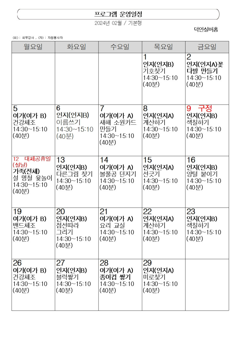 2024년 ♥덕인실버홈 2월 프로그램 계획표♥ 작성자 정보 관리자 작성 작성일 2024.02.02 10:59 컨텐츠 정보 139 조회 목록 본문 2024년 ♥덕인실버홈 2월 프로그램 계획표♥ SNS 공유 관련자료 이전 2024년 ♥덕인실버홈 3월 프로그램 계획표♥ 작성일 2024.03.04 10:03 다음 2024년 ♥덕인실버홈 1월 프로그램 계획표♥ 작성일 2023.12.31 21:52 댓글 0개 등록된 댓글이 없습니다. 로그인한 회원만 댓글 등록이 가능합니다. 목록