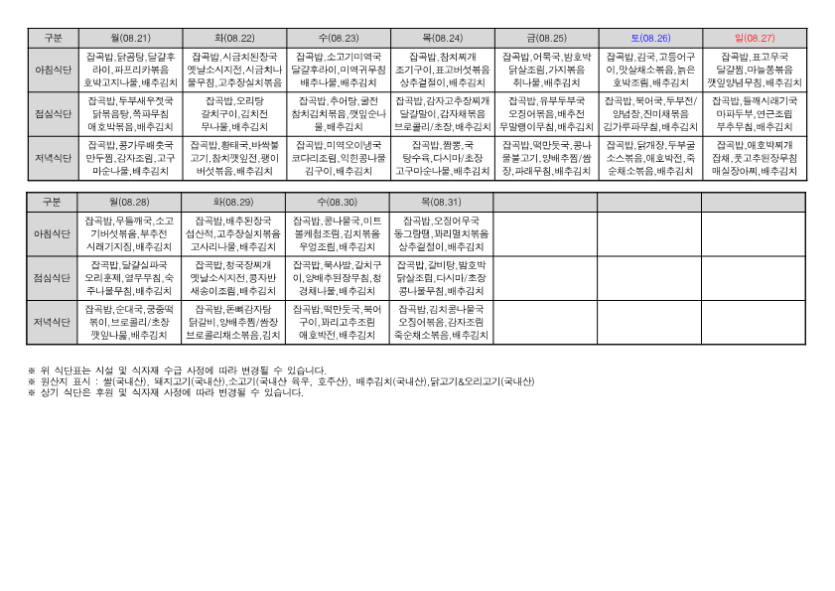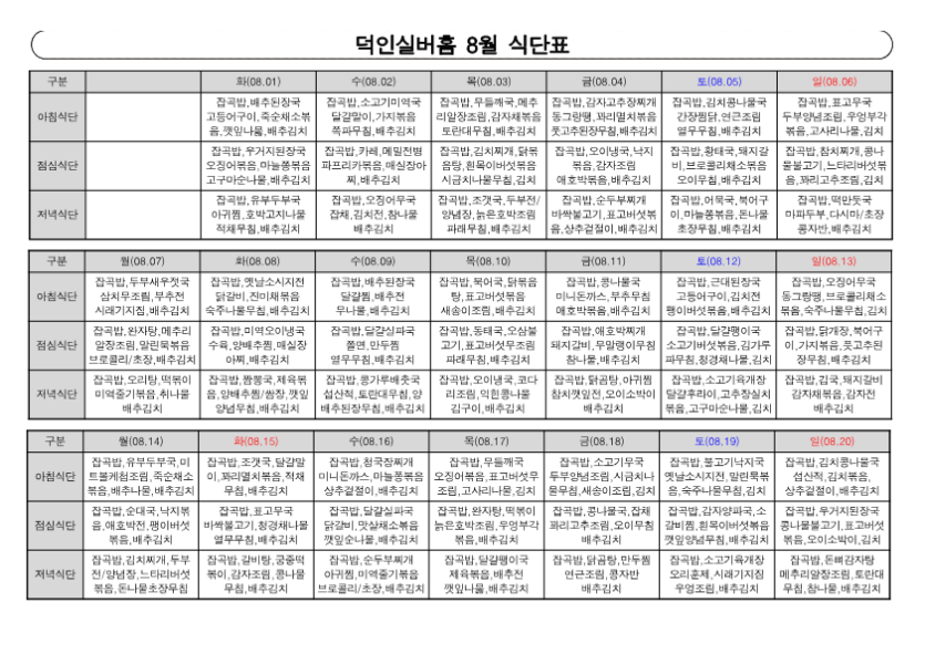 2023년 ♥덕인실버홈 8월 식단표♥ 작성자 정보 관리자 작성 작성일 2023.07.31 16:49 컨텐츠 정보 303 조회 목록 본문 2023년 ♥덕인실버홈 8월 식단표♥ SNS 공유 관련자료 이전 2023년 ♥덕인실버홈 9월 식단표♥ 작성일 2023.08.28 10:46 다음 2023년 ♥덕인실버홈 7월 식단표♥ 작성일 2023.06.30 16:18 댓글 0개 등록된 댓글이 없습니다. 로그인한 회원만 댓글 등록이 가능합니다. 목록