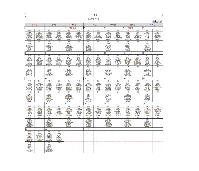 2025년 ♥덕인실버홈 6월 식단표♥ 작성자 정보 최고관리자 작성 작성일 2025.10.22 19:43 컨텐츠 정보 12 조회 목록 본문 2025년 ♥덕인실버홈 6월 식단표♥ SNS 공유 관련자료 이전 2025년 ♥덕인실버홈 7월 식단표♥ 작성일 2025.10.22 19:43 다음 2025년 ♥덕인실버홈 5월 식단표♥ 작성일 2025.10.22 19:43 댓글 0개 등록된 댓글이 없습니다. 로그인한 회원만 댓글 등록이 가능합니다. 목록