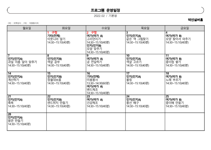 2022년 ♥덕인실버홈 2월 프로그램계획표 및 식단표♥ 작성자 정보 관리자 작성 작성일 2022.02.15 14:25 컨텐츠 정보 715 조회 목록 본문 덕인실버홈 2월 프로그램 운영일정표 및 식단표 SNS 공유 관련자료 이전 2022년 ♥덕인실버홈 3월 프로그램 계획표 및 식단표♥ 작성일 2022.03.01 09:56 다음 2022-♥덕인실버홈 1월 프로그램계획표 및 식단표♥ 작성일 2022.01.07 10:48 댓글 0개 등록된 댓글이 없습니다. 로그인한 회원만 댓글 등록이 가능합니다. 목록