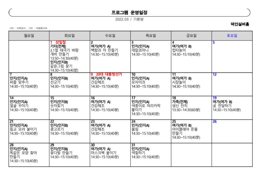 2022년 ♥덕인실버홈 3월 프로그램 계획표 및 식단표♥ 작성자 정보 관리자 작성 작성일 2022.03.01 09:56 컨텐츠 정보 750 조회 목록 본문 2022년 덕인실버홈 3월 프로그램 계획표 및 식단표 SNS 공유 관련자료 이전 2022년 ♥덕인실버홈 4월 프로그램 계획표 및 식단표♥ 작성일 2022.04.01 09:24 다음 2022년 ♥덕인실버홈 2월 프로그램계획표 및 식단표♥ 작성일 2022.02.15 14:25 댓글 0개 등록된 댓글이 없습니다. 로그인한 회원만 댓글 등록이 가능합니다. 목록
