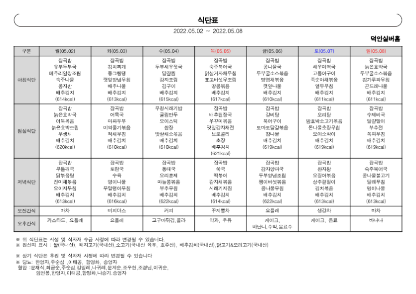 2022년 ♥덕인실버홈 5월 프로그램 계획표 및 식단표♥ 작성자 정보 관리자 작성 작성일 2022.04.29 15:49 컨텐츠 정보 601 조회 목록 본문 2022년 덕인실버홈 5월 프로그램 계획표 및 식단표 SNS 공유 관련자료 이전 2022년 ♥덕인실버홈 6월 프로그램 계획 및 식단표♥ 작성일 2022.06.04 14:26 다음 2022년 ♥덕인실버홈 4월 프로그램 계획표 및 식단표♥ 작성일 2022.04.01 09:24 댓글 0개 등록된 댓글이 없습니다. 로그인한 회원만 댓글 등록이 가능합니다. 목록