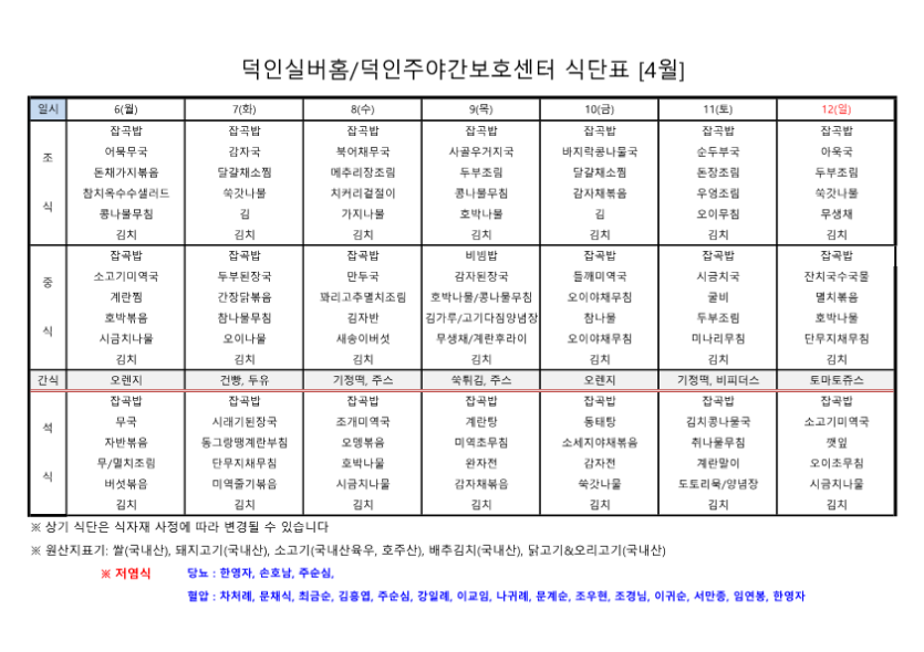♥덕인실버홈 04월 프로그램계획표 및 식단표♥ 작성자 정보 관리자 작성 작성일 2020.05.18 15:07 컨텐츠 정보 812 조회 목록 본문 ♥덕인실버홈 04월 프로그램계획표 및 식단표♥ SNS 공유 관련자료 이전 ♥덕인실버홈 05월 프로그램계획표 및 식단표♥ 작성일 2020.05.18 15:08 다음 ♥덕인실버홈 03월 프로그램계획표 및 식단표♥ 작성일 2020.03.03 11:51 댓글 0개 등록된 댓글이 없습니다. 로그인한 회원만 댓글 등록이 가능합니다. 목록