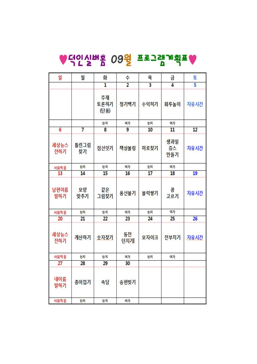 ♥덕인실버홈 09월 프로그램계획표 및 식단표♥ 작성자 정보 관리자 작성 작성일 2020.08.31 14:56 컨텐츠 정보 777 조회 목록 본문 *그날의 상황에 따라 프로그램이 변동될수 있습니다. SNS 공유 관련자료 이전 ♥덕인실버홈 10월 프로그램계획표 및 식단표♥ 작성일 2020.09.28 10:28 다음 ♥덕인실버홈 08월 프로그램계획표 및 식단표♥ 작성일 2020.07.27 15:38 댓글 0개 등록된 댓글이 없습니다. 로그인한 회원만 댓글 등록이 가능합니다. 목록