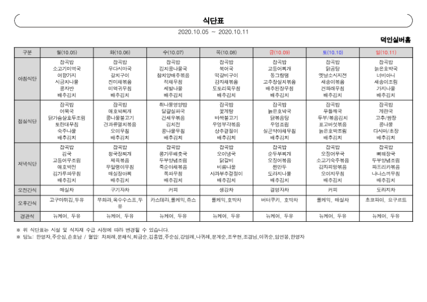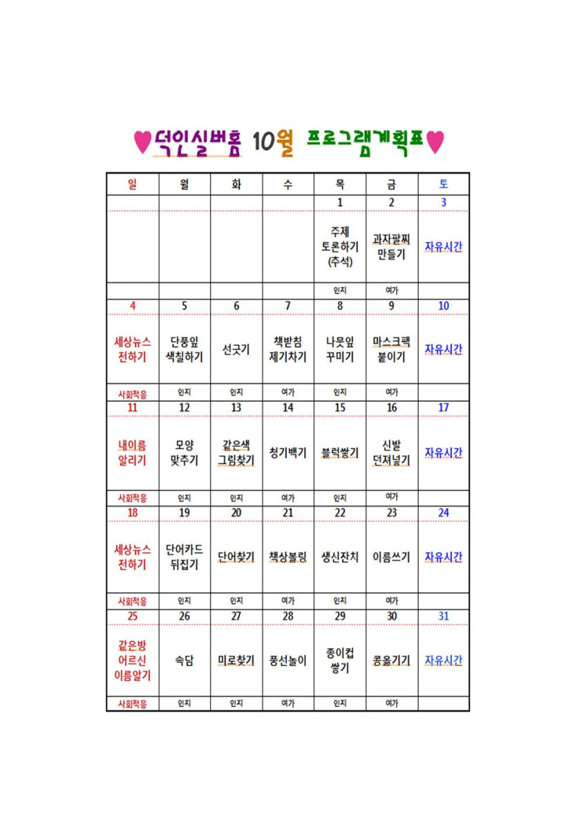 ♥덕인실버홈 10월 프로그램계획표 및 식단표♥ 작성자 정보 관리자 작성 작성일 2020.09.28 10:28 컨텐츠 정보 875 조회 목록 본문 *그날의 상황에 따라 프로그램이 변동될 수 있습니다. SNS 공유 관련자료 이전 ♥덕인실버홈 11월 프로그램계획표 및 식단표♥ 작성일 2020.10.31 10:59 다음 ♥덕인실버홈 09월 프로그램계획표 및 식단표♥ 작성일 2020.08.31 14:56 댓글 0개 등록된 댓글이 없습니다. 로그인한 회원만 댓글 등록이 가능합니다. 목록
