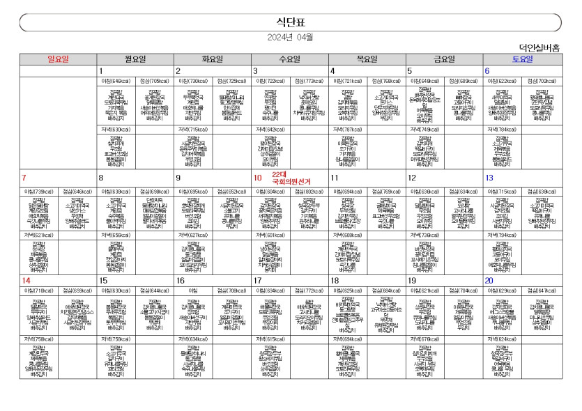 2024년 ♥덕인실버홈 4월 식단표♥ 작성자 정보 관리자 작성 작성일 2024.03.29 17:45 컨텐츠 정보 108 조회 목록 본문 2024년 ♥덕인실버홈 4월 식단표♥ SNS 공유 관련자료 이전 2024년 ♥덕인실버홈 5월 식단표♥ 작성일 2024.04.29 18:10 다음 2024년 ♥덕인실버홈 3월 식단표♥ 작성일 2024.02.29 16:51 댓글 0개 등록된 댓글이 없습니다. 로그인한 회원만 댓글 등록이 가능합니다. 목록
