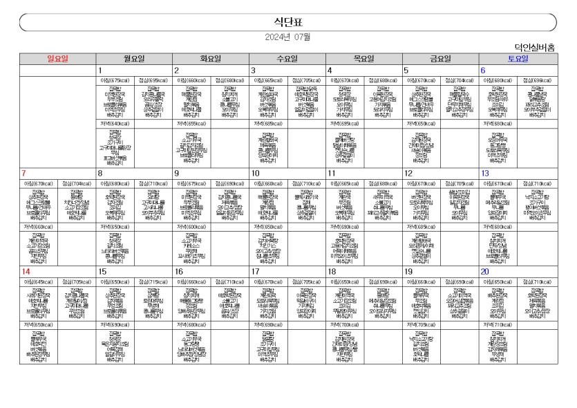2024년 ♥덕인실버홈 7월 식단표♥ 작성자 정보 관리자 작성 작성일 2024.06.28 12:12 컨텐츠 정보 94 조회 목록 본문 2024년 ♥덕인실버홈 7월 식단표♥ SNS 공유 관련자료 이전 2024년 ♥덕인실버홈 8월 식단표♥ 작성일 2024.07.31 14:03 다음 2024년 ♥덕인실버홈 6월 식단표♥ 작성일 2024.05.31 16:05 댓글 0개 등록된 댓글이 없습니다. 로그인한 회원만 댓글 등록이 가능합니다. 목록