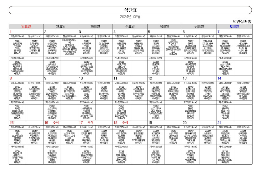 2024년 ♥덕인실버홈 9월 식단표♥ 작성자 정보 관리자 작성 작성일 2024.08.30 18:08 컨텐츠 정보 86 조회 목록 본문 2024년 ♥덕인실버홈 9월 식단표♥ SNS 공유 관련자료 이전 2024년 ♥덕인실버홈 10월 식단표♥ 작성일 2024.09.30 16:52 다음 2024년 ♥덕인실버홈 8월 식단표♥ 작성일 2024.07.31 14:03 댓글 0개 등록된 댓글이 없습니다. 로그인한 회원만 댓글 등록이 가능합니다. 목록