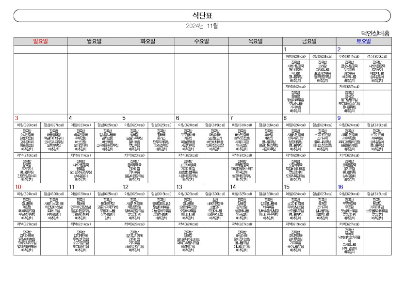 2024년 ♥덕인실버홈 11월 식단표♥ 작성자 정보 관리자 작성 작성일 2024.10.31 15:54 컨텐츠 정보 89 조회 목록 본문 2024년 ♥덕인실버홈 11월 식단표♥ SNS 공유 관련자료 이전 2024년 ♥덕인실버홈 12월 식단표♥ 작성일 2024.12.02 15:14 다음 2024년 ♥덕인실버홈 10월 식단표♥ 작성일 2024.09.30 16:52 댓글 0개 등록된 댓글이 없습니다. 로그인한 회원만 댓글 등록이 가능합니다. 목록