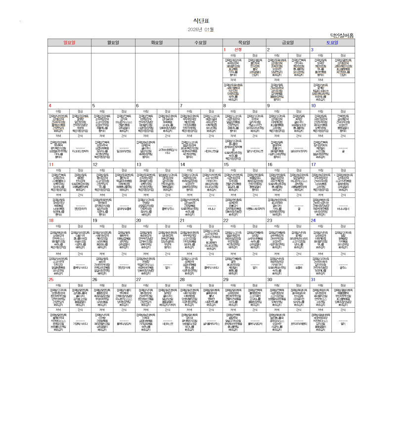 2026년 ♥덕인실버홈 1월 식단표♥ 작성자 정보 최고관리자 작성 작성일 2025.12.26 11:55 컨텐츠 정보 19 조회 목록 본문 2026년 ♥덕인실버홈 1월 식단표♥ SNS 공유 관련자료 다음 2025년 ♥덕인실버홈 12월 식단표♥ 작성일 2025.12.01 16:39 댓글 0개 등록된 댓글이 없습니다. 로그인한 회원만 댓글 등록이 가능합니다. 목록