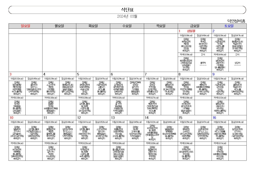 2024년 ♥덕인실버홈 3월 식단표♥ 작성자 정보 관리자 작성 작성일 2024.02.29 16:51 컨텐츠 정보 131 조회 목록 본문 2024년 ♥덕인실버홈 3월 식단표♥ SNS 공유 관련자료 이전 2024년 ♥덕인실버홈 4월 식단표♥ 작성일 2024.03.29 17:45 다음 2024년 ♥덕인실버홈 2월 식단표♥ 작성일 2024.01.31 12:00 댓글 0개 등록된 댓글이 없습니다. 로그인한 회원만 댓글 등록이 가능합니다. 목록