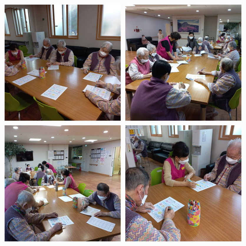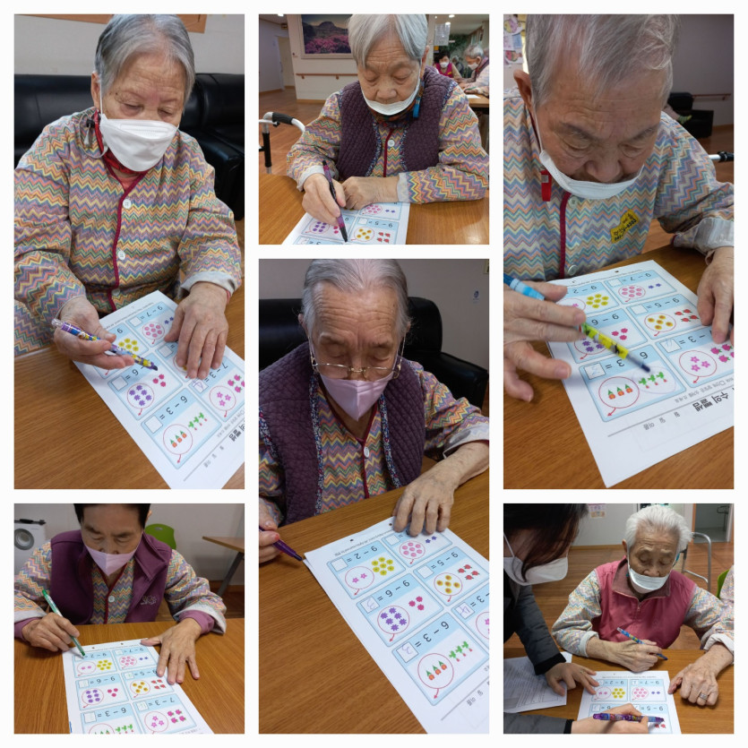 '계산하기' 인지프로그램 활동 작성자 정보 관리자 작성 작성일 2022.12.21 09:05 컨텐츠 정보 1,622 조회 목록 본문 저희 어르신들께서 '계산하기' 일지활동 프로그램에 열심히 참여하셨습니다. SNS 공유 관련자료 이전 '숨은 그림 찾기' 활동으로 집중력을 높으셨습니다. 작성일 2022.12.21 09:13 다음 크리스마스 트리 꾸미기 활동을 신나게 해보셨습니다. 작성일 2022.12.20 14:06 목록