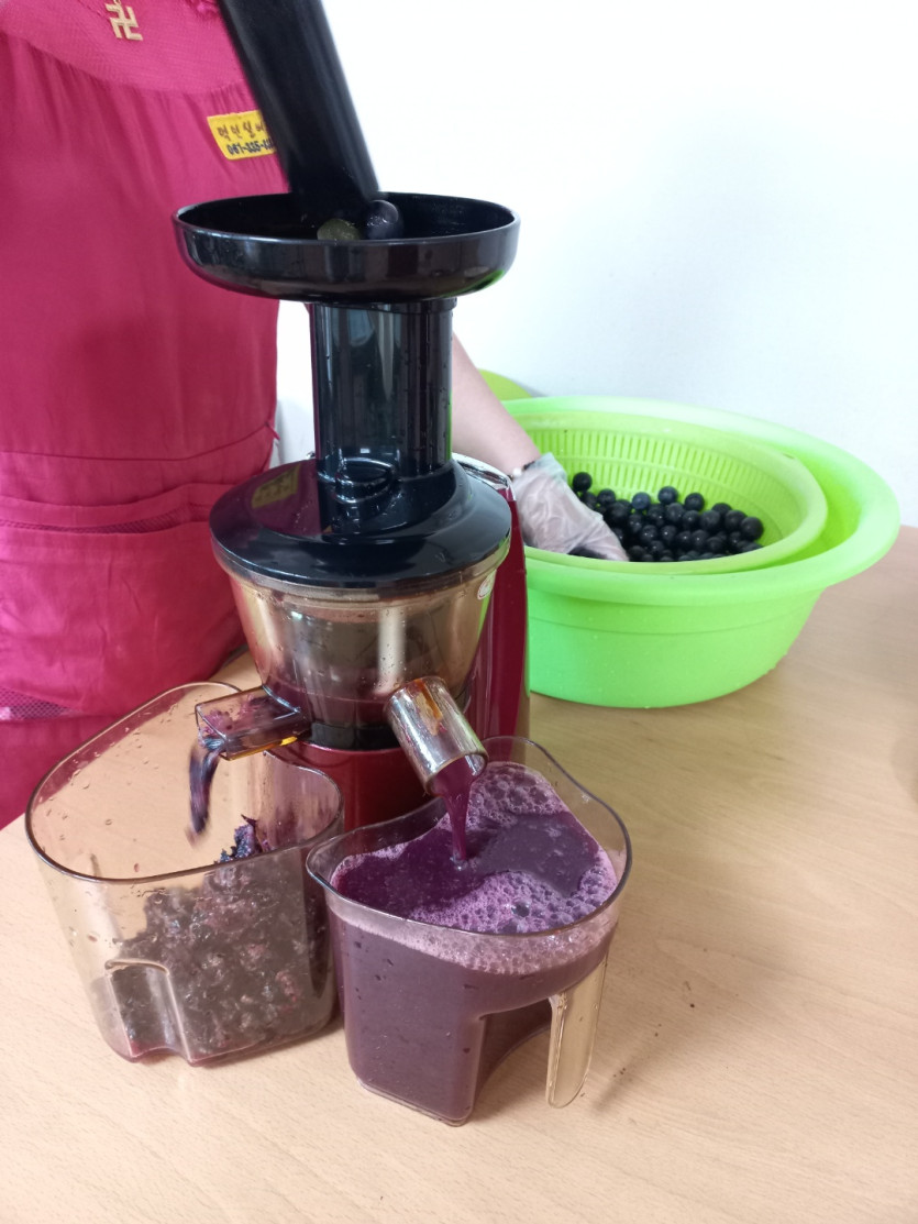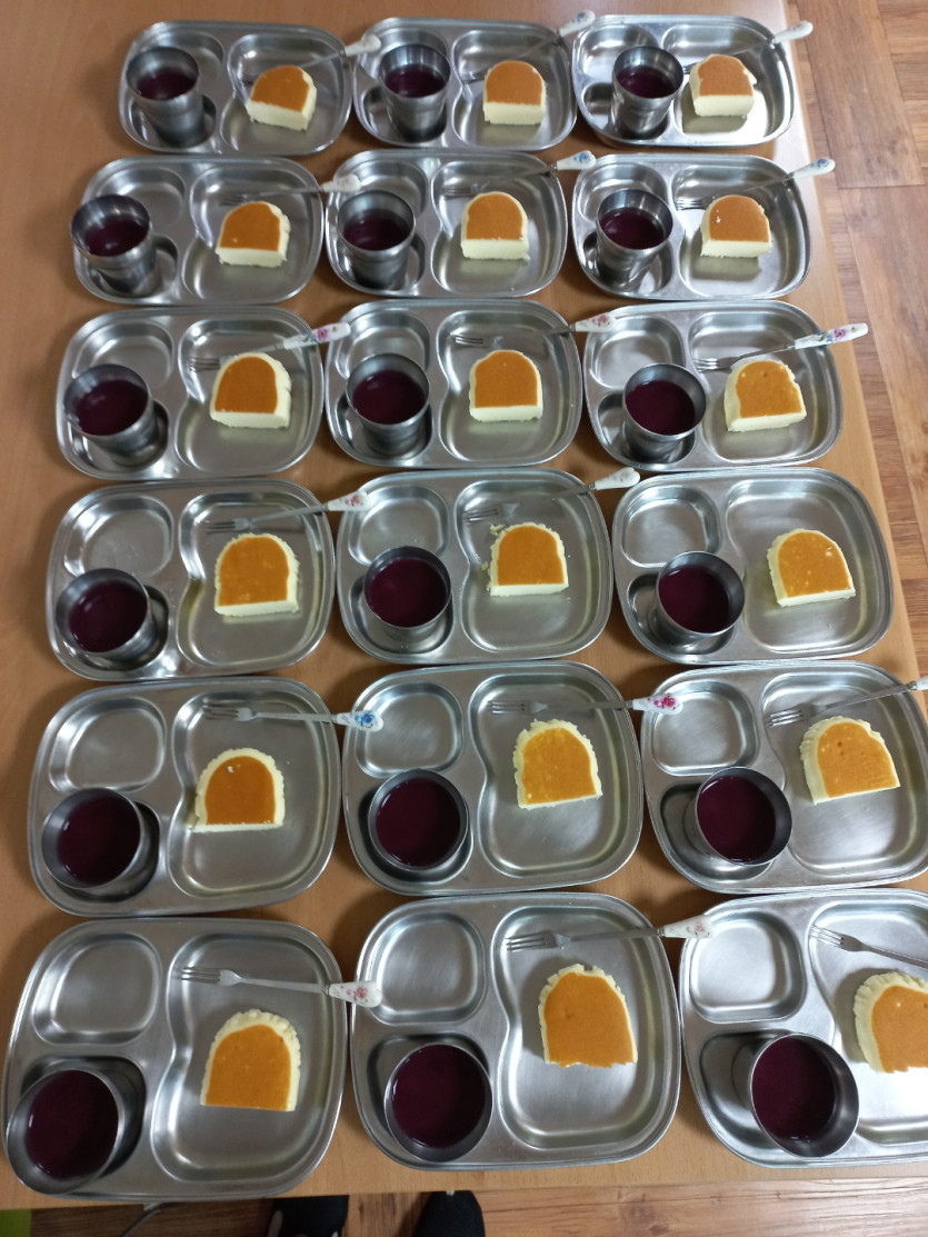 오후 간식으로 직접 휴롬에 갈은 포도주스와 부드러운 치즈케잌을 드렸습니다.
