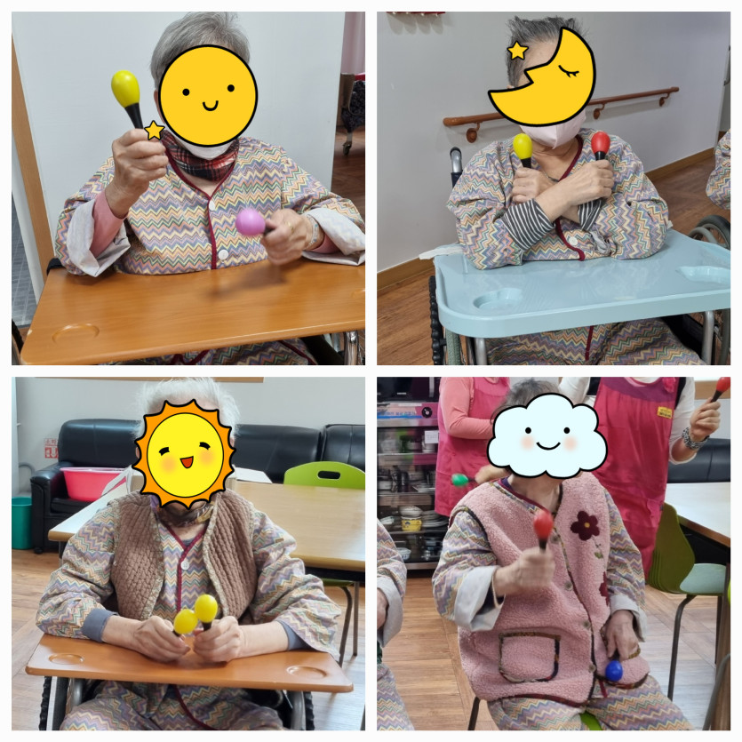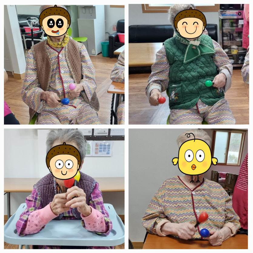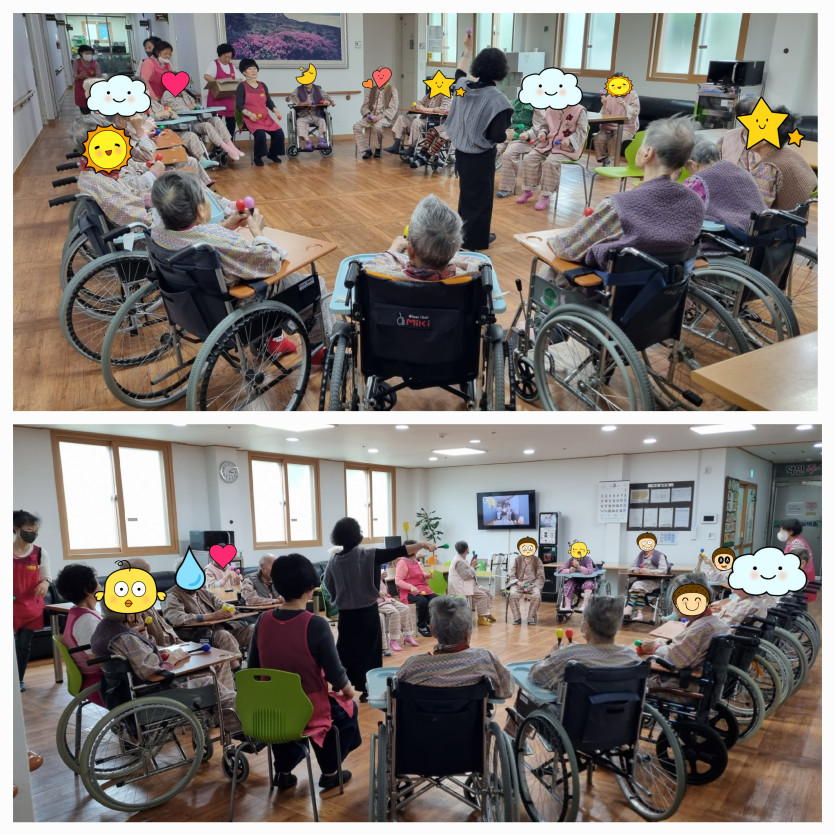 어르신들께서 지루하지 않도록 밴드, 마라카스, 맨손 등 다양한 방법으로 구성되어 있습니다.