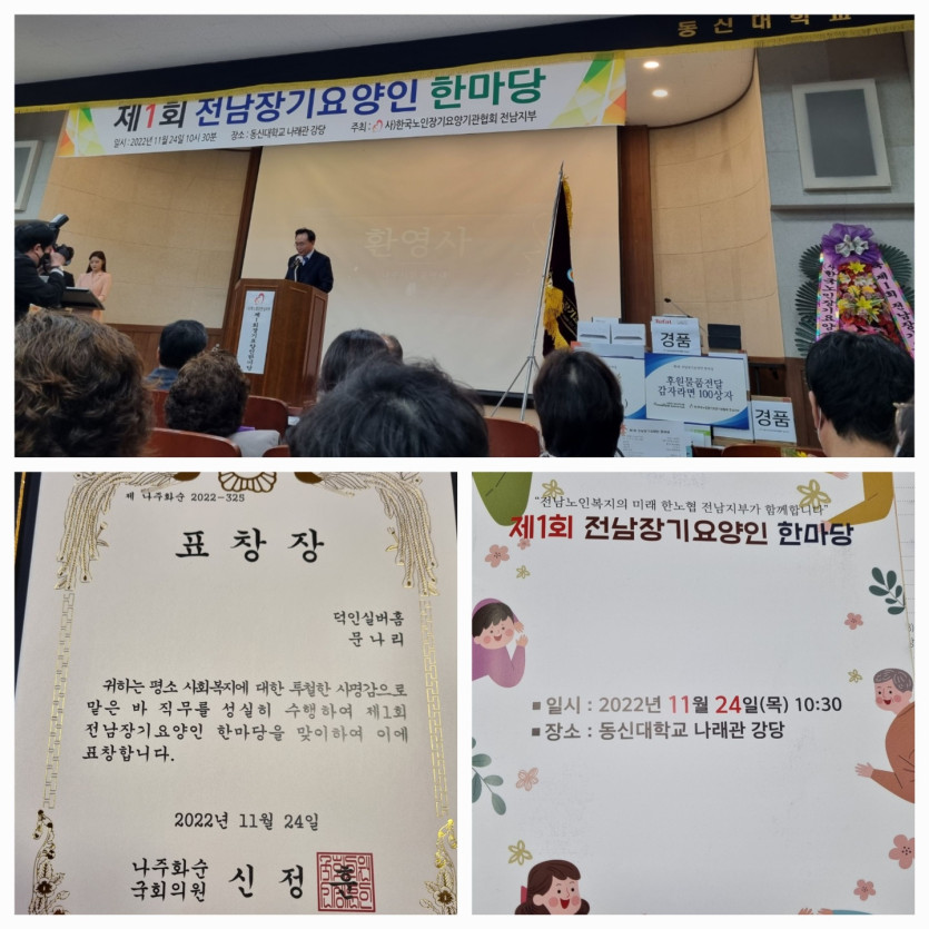 '제1회 전남장기요양인 한마당' 행사에서 저희 덕인실버홈 원장님께서 장기요양 기관 우수시설장으로 국회의원상을 수상하셨습니다.