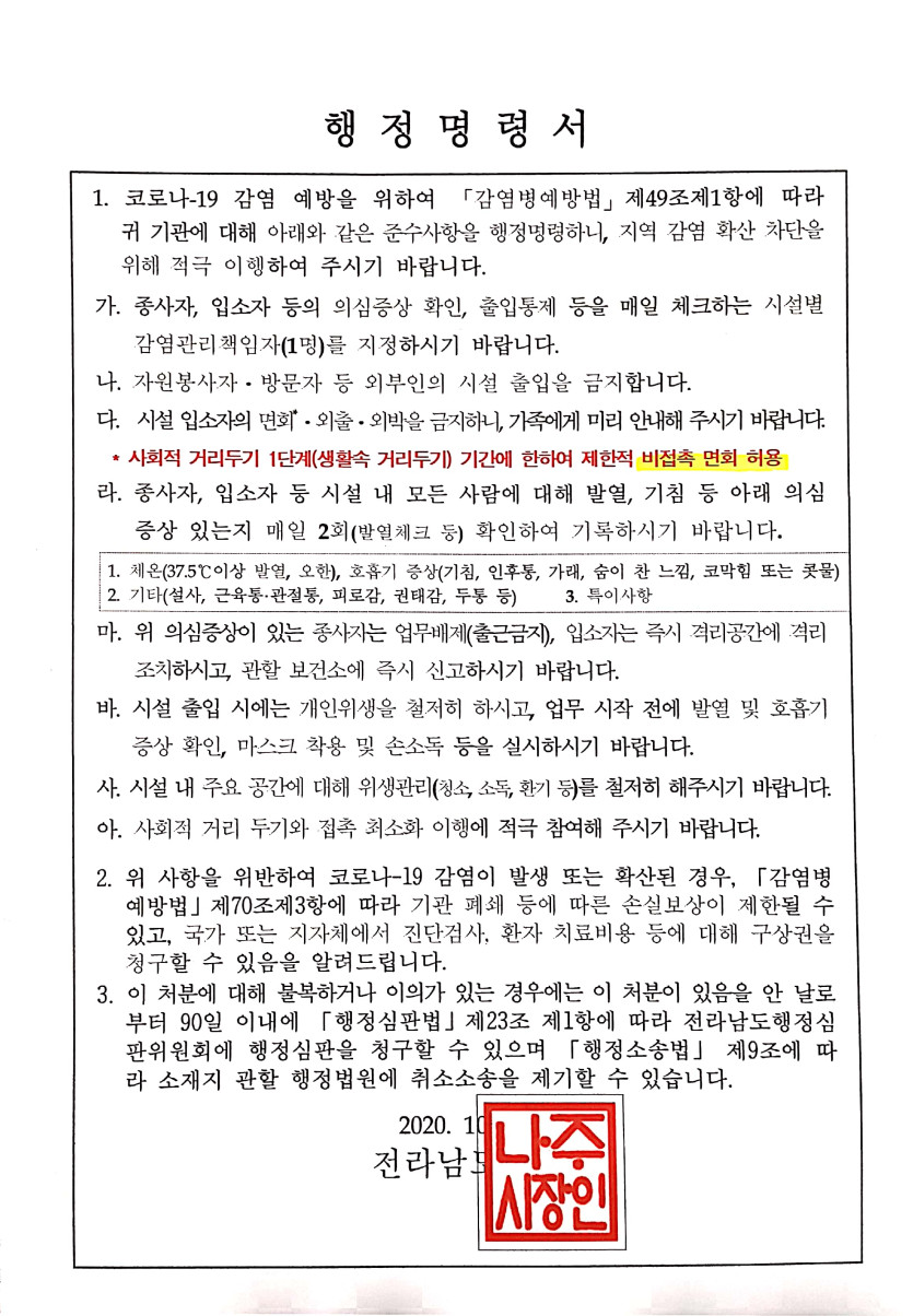 사회적 거리두기가 1단계로 하향됨에 따라 제한적 비접촉 면회가 가능하게 되었습니다.