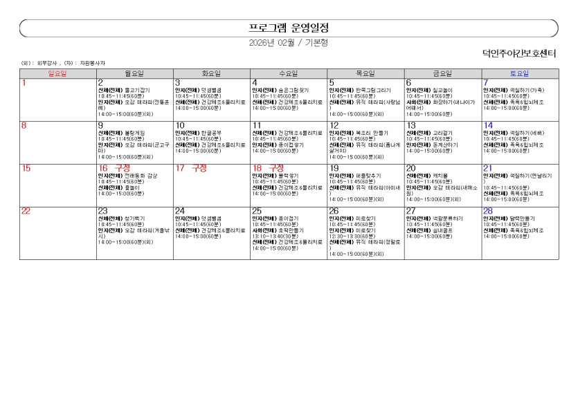 2026년 02월 덕인주야간보호센터 프로그램 계획표 작성자 정보 최고관리자 작성 작성일 2026.03.31 12:24 컨텐츠 정보 3 조회 목록 본문 2026년 02월 덕인주야간보호센터 프로그램 계획표 SNS 공유 관련자료 이전 2026년 03월 덕인주야간보호센터 프로그램 계획표 작성일 2026.03.31 12:26 다음 2026년 01월 덕인주야간보호센터 프로그램 계획표 작성일 2026.03.31 12:21 댓글 0개 등록된 댓글이 없습니다. 로그인한 회원만 댓글 등록이 가능합니다. 목록