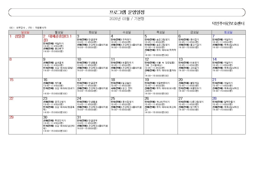 2026년 03월 덕인주야간보호센터 프로그램 계획표 작성자 정보 최고관리자 작성 작성일 2026.03.31 12:26 컨텐츠 정보 3 조회 목록 본문 2026년 03월 덕인주야간보호센터 프로그램 계획표 SNS 공유 관련자료 이전 2026년 04월 덕인주야간보호센터 프로그램 계획표 작성일 2026.03.31 12:27 다음 2026년 02월 덕인주야간보호센터 프로그램 계획표 작성일 2026.03.31 12:24 댓글 0개 등록된 댓글이 없습니다. 로그인한 회원만 댓글 등록이 가능합니다. 목록