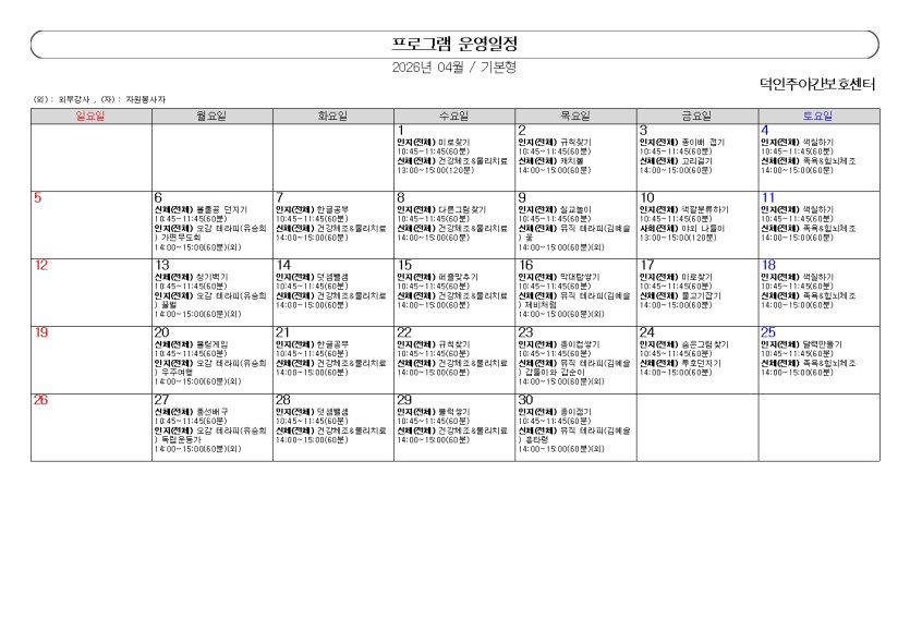 2026년 04월 덕인주야간보호센터 프로그램 계획표 작성자 정보 최고관리자 작성 작성일 2026.03.31 12:27 컨텐츠 정보 4 조회 목록 본문 2026년 04월 덕인주야간보호센터 프로그램 계획표 SNS 공유 관련자료 다음 2026년 03월 덕인주야간보호센터 프로그램 계획표 작성일 2026.03.31 12:26 댓글 0개 등록된 댓글이 없습니다. 로그인한 회원만 댓글 등록이 가능합니다. 목록